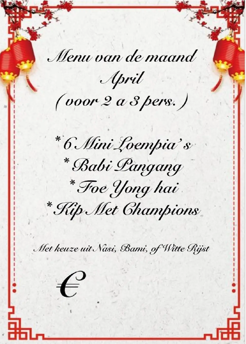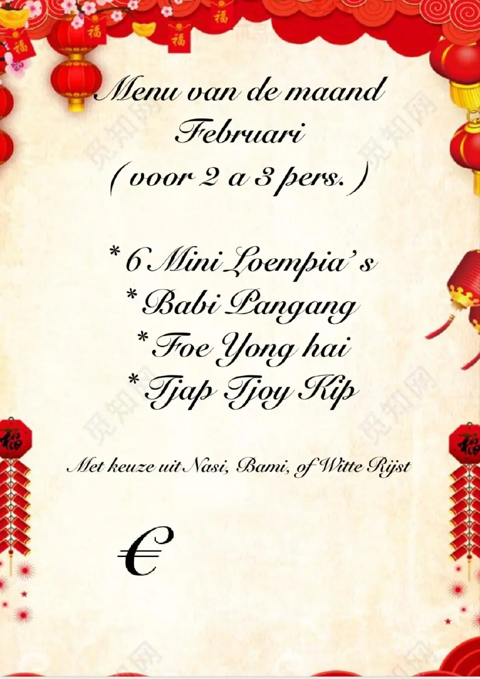 • Voor 2 a 3 personen. - 6 pangsitgoreng - babi pangang spek - Indischgestoofd rundvlees - saté ajam